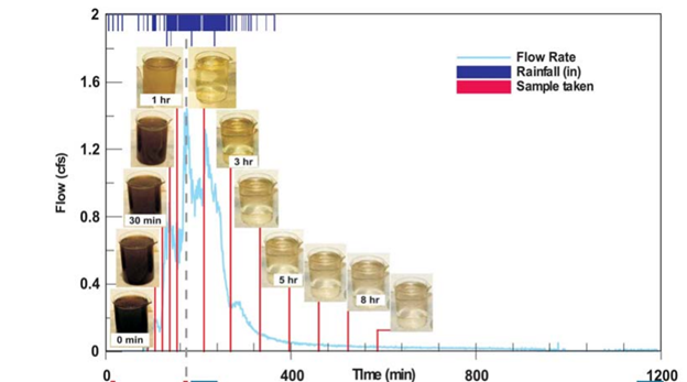 מתארת את ההשפעה הוויזואלית של נגר מ"גשם ראשון". באיור מס' 2 אפשר לראות כי בפרק זמן קצר של עד שעה, התקבלו דוגמאות הממחישות את הזיהום באופן ויזואלי. מקור הצבע הכהה מקורו בתשטיפי כבישים ומדרכות שמכילים שמנים מינרליים, שאריות דלקים, חלקיקי גומי מצמיגים, אבק וכיוצ"ב. ככל שהזרימה ממשיכה במהלך השעה הראשונה צבע הדוגמאות מתבהר באופן חד.
